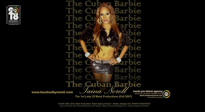 Sexy, Gifted and Flawless, Taina Norell from Florida was the 1st Transgender Female and 1st Talent to register with the Agency during its early pre-promotional years on MySpace in 2006-07, and during her early phase of transition. Starting out as a renowned Impersonator / Drag Performer to now being a FABULOUS Make-Up Artist, Painter & Illustrator, Taina is well on her way in becoming a household name. Her 1st Solo Ad appearance with the agency was December 2007 as our 1st Trans Talent of the Month. Visit her website at: www.touchedbynorell.com and STAY TUNED For Our NEW Anniversary Video Commentary on Taina This Fall!